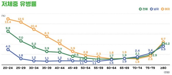 반면 저체중의 경우 남성은 80세 이상의 높은 연령(5.5%)에서, 여성은 20~24세의 낮은 연령(13.4%)에서 유병률이 가장 높았다.