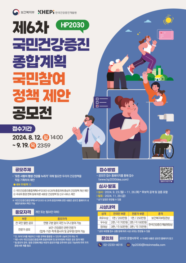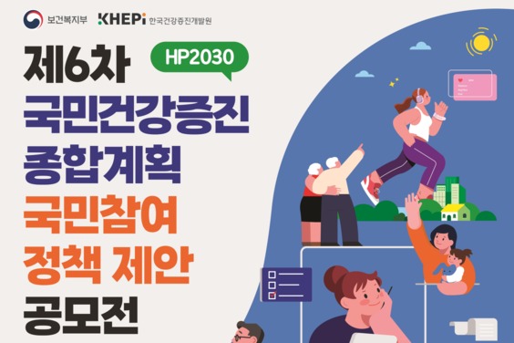 [메디칼업저버 배다현 기자] 보건복지부(장관 조규홍)와 한국건강증진개발원(원장 김헌주)은 '제6차 국민건강증진종합계획 국민참여 정책 제안 공모전'을 개최한다.