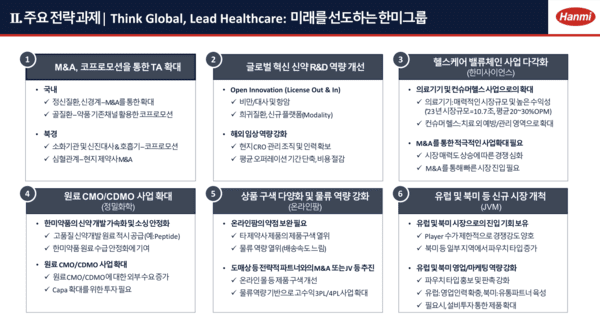 공개된 보고서에는 ▲M&A, 코프로모션을 통한 TA확대 ▲글로벌 혁신 신약R&D 역량개선 ▲헬스케어 밸류체인 사업 다각화(한미사이언스) ▲원료CMO/CDMO 사업확대(정밀화학) ▲상품 구색 다양화 및 물류역량 강화(온라인팜) ▲유럽 및 북미 등 신규시장 개척(JVM) 등 크게 6가지 전략이 담겼다.