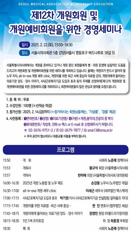 [메디칼업저버 김지예 기자] 서울특별시의사회는 2월 22일 오후 3시 50분 서울시의사회 회관 5층 강당에서 '제12차 개원회원 및 개원예비회원을 위한 경영세미나'를 개최한다.