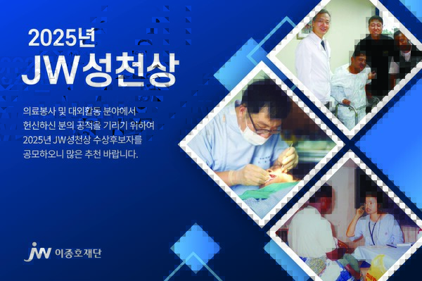 [메디칼업저버 배다현 기자] JW중외제약의 공익재단인 JW이종호재단은 2025 JW성천상 수상 후보자를 공모한다고 18일 밝혔다.
