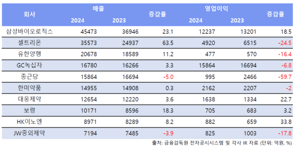 2024년 가장 많은 매출을 올린 삼성바이오로직스는 4조5473억원으로 3조6946억원이었던 전년 대비 23.1% 성장했다. 같은 기간 영업이익은 1조3201억원으로 1조2237억원이었던 전년 대비 18.5% 성장했다.