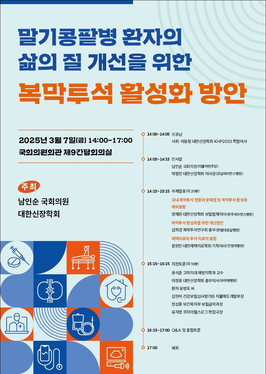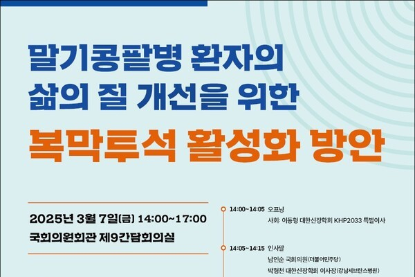 대한신장학회(이사장 박형천, 연세대 강남세브란스병원)는 남인순 국회의원과 7일 국회의원회관 제9간담회의실에서 '말기콩팥병 환자의 삶의 질 개선을 위한 복막투석 활성화 방안' 정책토론회를 개최한다.