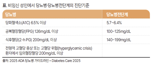 2025년 가이드라인에서도 당뇨병 진단은 “A1C 또는 혈장혈당(plasma glucose) 기준인 FPG, 2-h PG에 근거한다”고 권고한 것이다.