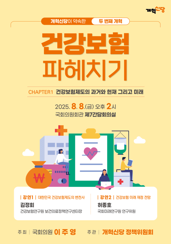 [메디칼업저버 김지예 기자] 개혁신당 이주영 정책위의장이 오는 8일 오후 2시 국회의원회관 제7간담회의실에서 '건강보험 파헤치기 ChapterⅠ: 건강보험제도의 과거와 현재 그리고 미래'를 개최한다. 먼저 진행되었던 '국민연금 파헤치기'에 이은 두 번째 세미나다.
