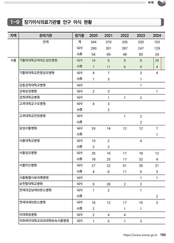 국립장기조직혈액관리원이 7월 공개한 '2024년도 장기등 기증 및 이식 통계연보'에 따르면, 국내 기증 안구를 이용한 각막이식은 총 153건이었고, 이 중 여의도성모병원이 19.6%에 해당하는 30건(뇌사 26건, 사후 4건)을 차지했다.