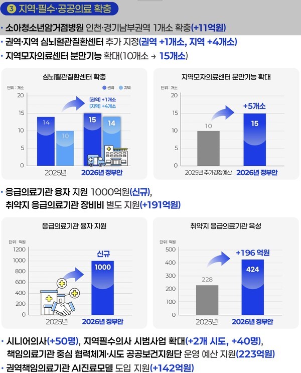 지방의료원의 필수 진료과목 운영을 지원하고, 권역책임의료기관 대상 중증환자 필수 시설.장비를 지원하며, 142억월을 들여 AI 진료모델을 도입할 계획이다.