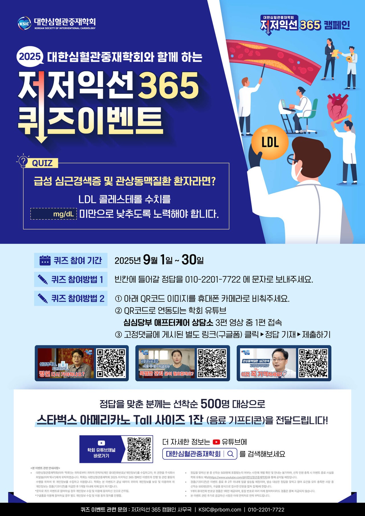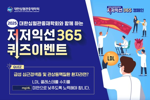 또 병원을 찾는 환자와 보호자를 대상으로 55mg/dL 미만의 LDL-콜레스테롤 수치 관리를 강조하는 퀴즈 이벤트도 9월 한 달간 진행한다. 이벤트 포스터 안내에 따라 문자 메시지 또는 대한심혈관중재학회 유튜브 영상에 게시된 링크를 통해 퀴즈 이벤트에 참여할 수 있다.