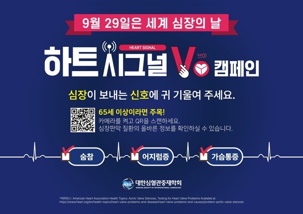[메디칼업저버 박선혜 기자] 대한심혈관중재학회가 9월 29일 세계 심장의 날을 맞아 심장 판막질환 위험성을 알리고 조기 진단을 독려하기 위한 '하트시그널V 캠페인'을 진행한다고 2일 밝혔다.