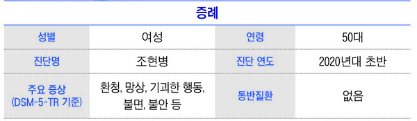 상기 환자는 2020년대 초반 최초 시작된 환청과 망상, 두려움 등을 주소로 내원했다. 내원 4개월 전 안검하수 수술 시행 후 이상을 느꼈으며, 수술 시 의식이 있는 상태로 무서운 느낌을 받았다며 호소하는 등 원래 예민한 성격이었다. 두드러진 기분 문제는 없었으나 극심한 공포감으로 인해 망상이 동반되어 잡귀를 쫓아내는 제사까지 두 차례 시행하고 결국 입원했으며, 그 당시 Positive and Negative Syndrome Scale (PANSS) 점수는 102점이었다. 안정적인 환경에서 aripiprazole 10 mg 사용 후 망상 및 환청이 감소하며 PANSS 점수 78점으로 퇴원 조치했다<표 1>.