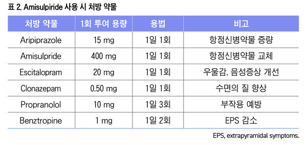 하지만, 퇴원 후에 망상이 다시 악화되는 양상을 보여, 머릿속에서 여러 명이 대화하며 행동을 할 때마다 관여하는 느낌이 든다고 보고했다. 보호자 보고상 일상생활은 안정적이지만 증상 때문에 힘들어한다고 해 효과가 부족하다고 판단했다. 이에 3개월간 paliperidone을 함께 사용했으나 반응이 전혀 관찰되지 않았다. 이에 초반에 효과를 보인 aripiprazole은 유지하고 paliperidone 대신 amisulpride를 사용해 부분적인 효과는 있었으나 여전히 잔류 증상이 명확했고, 이 과정에서 체중이 약 10 kg 가량 증가했다<표 2>.