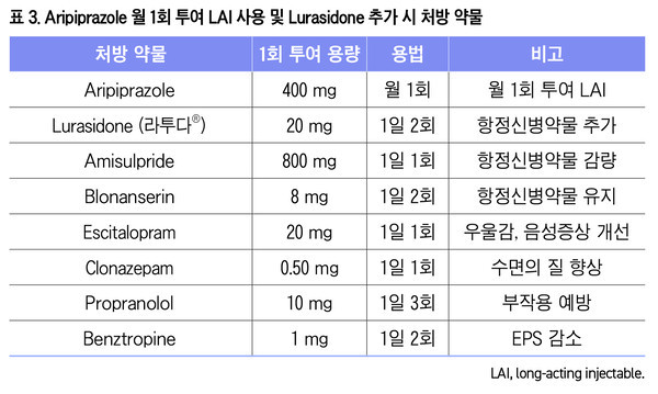 잔류 환청이 지속되며 하느님 소리가 반복됐고, 체중 또한 10 kg 이상 증가해, aripiprazole 장기지속형 주사제(long-acting injectable, LAI)와 clozapine 사용에 대해 환자와 보호자에게 설명했고, 잔류 증상에도 불구하고 일상생활이 유지되고 있기 때문에 반복적인 피검사가 수반되는 clozapine 대신 aripiprazole LAI를 선택했다. Aripiprazole LAI을 사용한지 8개월째, 여전히 환청이 지속되고 더 이상의 호전이 없어 lurasidone 40 mg을 추가하기로 결정했다<표 3>.