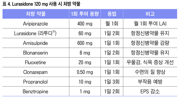 일상생활은 비교적 잘 유지되고 있으나 명확한 잔류 증상을 호소하고 있는 환자의 증상 개선을 위해 lurasidone을 처방했다. 이미 다른 항정신병약물을 충분한 용량 및 기간 동안 사용했고 그간 추체외로증상(extrapyramidal symptoms, EPS)나 체중 증가와 같은 부작용으로 인해 환자의 불편감이 증가된 상태였다. 이러한 요소를 종합적으로 고려해 lurasidone을 추가했다. 투약 후 호소하는 부작용 없이 잔류 증상의 감소가 분명히 관찰돼 환자는 만족감을 드러냈으며 현재 다른 항정신병약물을 감량하고 lurasidone은 지속적으로 투여하고 있다.