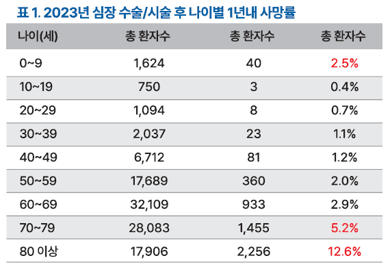 2023년 심장질환으로 수술 또는 시술받은 환자는 총 10만 8004명이었다. 이 중 치료 이후 1년 이내 사망한 환자는 5159명이었고 전체 사망률은 4.78%로 조사됐다.