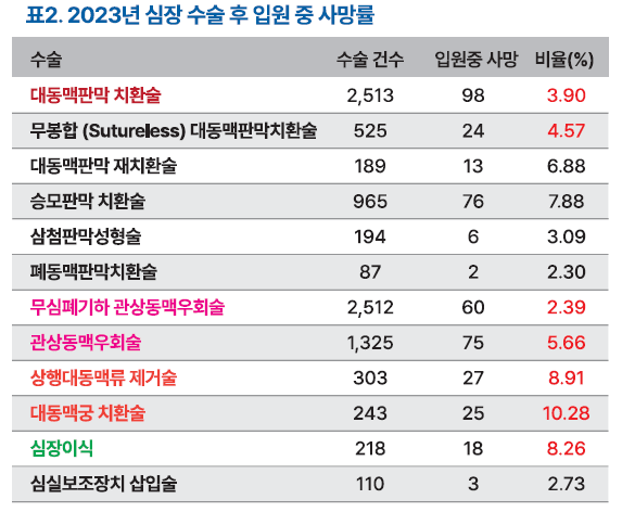 2023년 진행된 심장수술 중 가장 많이 진행된 치료는 대동맥판막 치환술로 2513건을 기록했고, 수술 이후 입원 중 사망률은 3.90%로 조사됐다. 그 다음으로 많이 진행된 수술은 승모판막 치환술로 965건이었고, 입원 중 사망률은 7.88%로 파악됐다. 그 외 삼첨판막 성형술의 입원 중 사망률은 3.09%, 무심폐기하 관상동맥우회술은 2.39%, 관상동맥 우회술은 5.66%로 조사됐다.