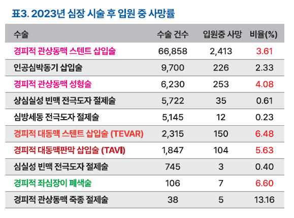 2023년 가장 많이 시행된 심장시술인 경피적 관상동맥 스텐트 삽입술의 입원 중 사망률은 3.61%를 기록했다. 두 번째로 많이 이뤄진 시술은 인공심박동기 삽입술로 9700건 진행됐고, 입원 중 사망률은 2.33%로 조사됐다. 경피적 대동맥판막 삽입술 건수는 1847건이었고, 입원 중 사망률은 5.63%였다.
