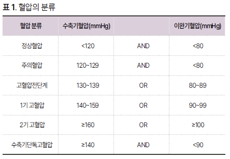 혈압 분류는 정상혈압(<120/80mmHg), 주의혈압(120~129/<80mmHg), 고혈압전단계(130~139/80~89mmHg), 1기 고혈압(140~159/90~99mmHg), 2기 고혈압(≥160/100mmHg)으로 나뉜다.