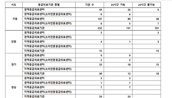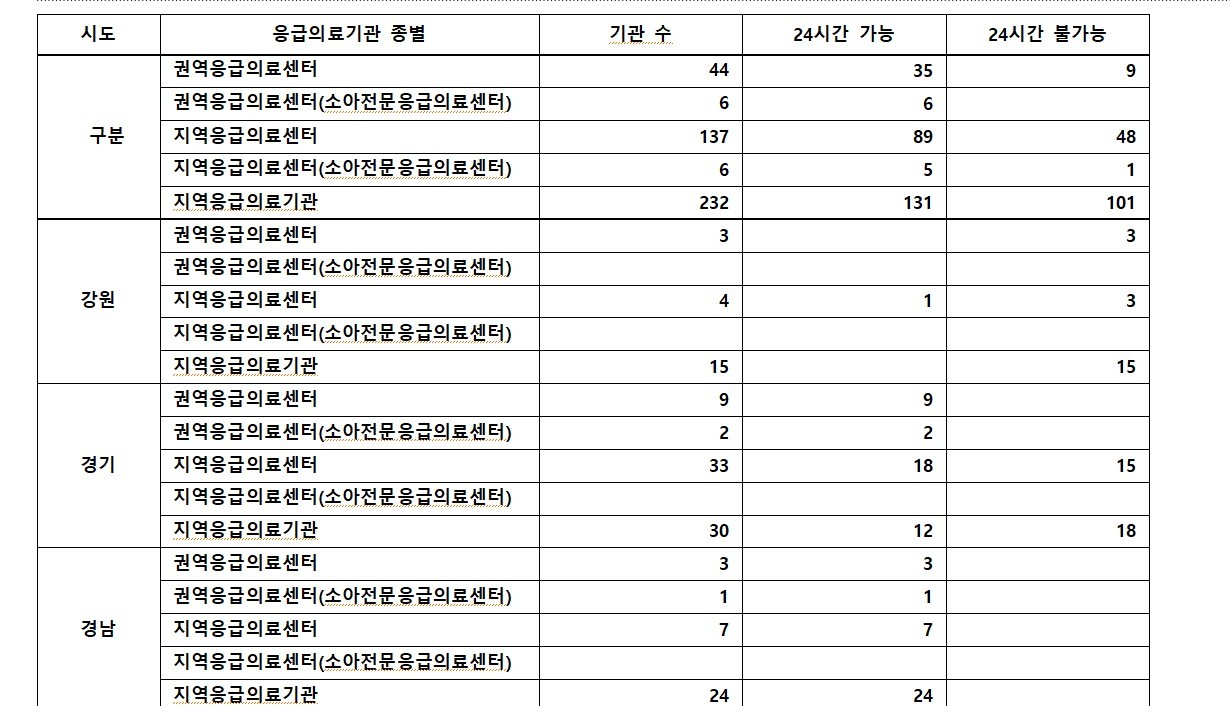 특히 지역별 편차는 매우 컸다. 강원도는 권역·지역응급의료기관을 모두 합쳐 22곳이 지정돼 있지만, 이 중 24시간 소아응급환자 진료가 가능한 곳은 단 1곳뿐이었다. 부산 역시 29개 응급의료기관 중 24시간 진료가 가능한 곳이 단 1곳에 그쳤다. 반면 서울은 52개 중 32곳, 경기도는 74개 중 41곳이 24시간 소아응급환자 진료가 가능해, 지역 간 의료 접근성이 심각하게 불균형한 것으로 나타났다.
