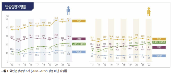 국민건강영양조사(2022)에 따르면 성인 비만 유병률은 남성 47.7%, 여성 25.7%로 나타났다.