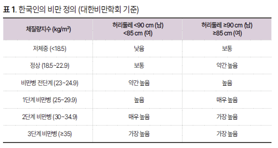 대한비만학회 및 아시아·태평양 기준에서는 체질량지수(BMI) ≥25kg/㎡를 비만으로 정의하며 복부비만은 남성 허리둘레 ≥90cm, 여성 ≥85cm로 정의된다.