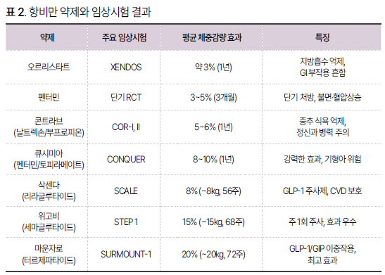 현재 국내에서 사용 가능한 약물은 오르리스타트, 펜터민, 큐시미아(펜터민/토피라메이트), 콘트라브(날트렉손/부프로피온), 삭센다(리라글루타이드), 위고비(세마글루타이드), 마운자로(터르제파타이드) 등이 있으며, 각각 기전과 효과, 부작용 프로파일이 다르다.
