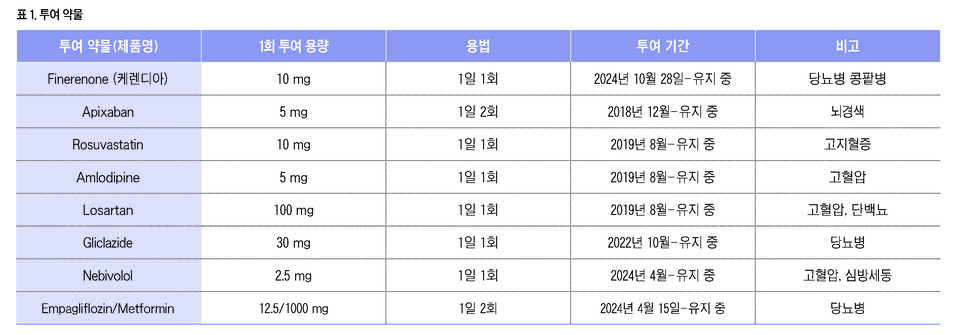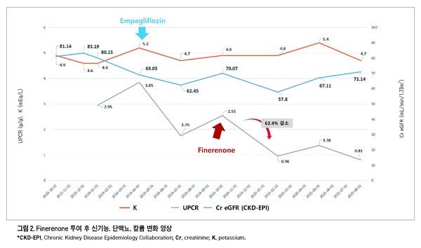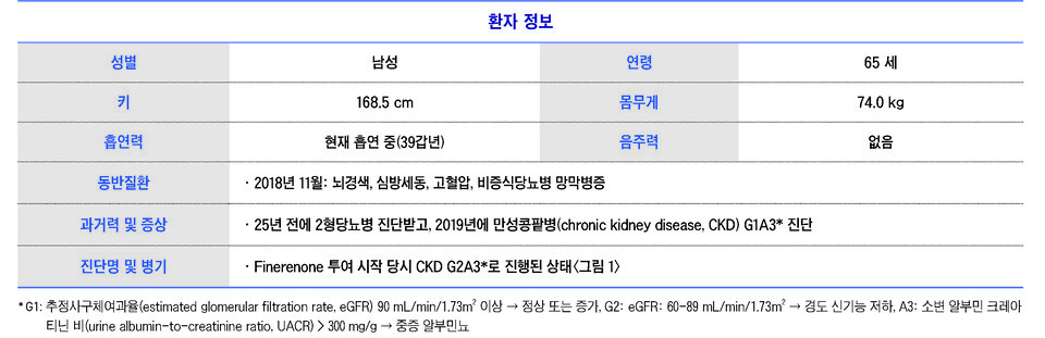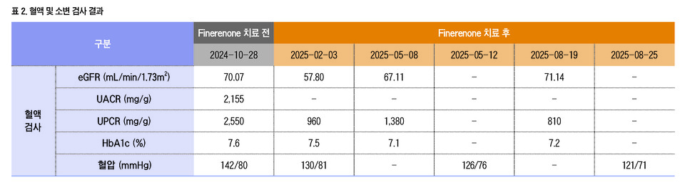 65세 남자 환자가 25년 전에 2형당뇨병을 진단받아 경구혈당강하제를 복용 중이었다. 2018년에 뇌경색 발생 당시 심방세동, 고혈압, 비증식당뇨병 망막병증을 함께 진단받았다. 이후 2019년에 UACR 2,470 mg/g으로 확인돼 당시 CKD G1A3로 진단됐다. 2020년에 지속되는 단백뇨로 신장내과에 협진돼 losartan을 100 mg으로 증량하고 nebivolol을 추가해 혈압을 조절했으며, 저단백식이를 포함한 식이요법을 시행했다. 하지만 이후로도 UACR 1,900-2,800 mg/g, 소변 단백질 크레아티닌 비(urine protein-to-creatinine ratio, UPCR) 2.3 g/g으로 단백뇨가 지속됐다. CKD가 점진적으로 진행해 2024년 10월에는 CKD G2A3로 확인됐고, 단백뇨 감소와 질환 진행 억제 및 심혈관 위험인자 관리를 위해 2024년 10월 28일부터 finerenone (케렌디아) 10 mg을 1일 1회 투여하기 시작했다. Finerenone 복용 시작 시 apixaban, rosuvastatin, amlodipine, losartan, gliclazide, nebivolol, empagliflozin/metformin 등을 복용하고 있었다<표 1>.