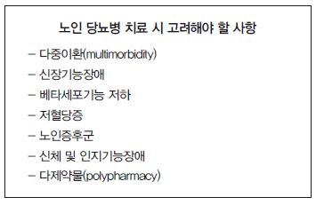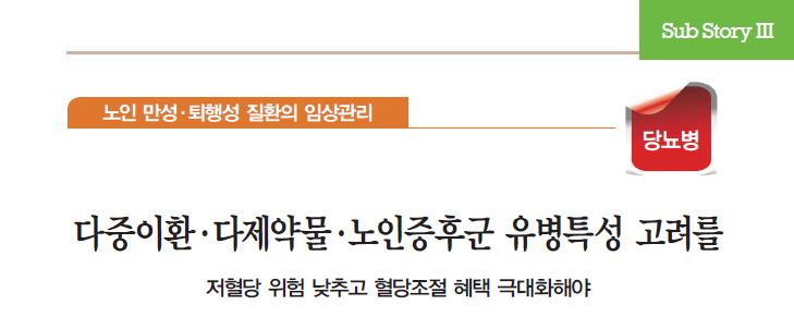 미국노인병학회(AGS)는 지난 2013년 발표된 ‘노인 당뇨병 가이드라인’을 통해 당뇨병 고령 환자들의 조기사망, 관상동맥질환, 뇌졸중 위험이 비당뇨병 환자에 비해 높다”고 밝혔다. 고연령대의 당뇨병 환자들이 열악한 신체기능 및 삶의 질, 장애, 허약(frailty) 등 신체적 결함과 함께 고혈압, 지질이상, 근골격계기능장애, 신장기능장애 등 다수의 질환을 동반하기 때문이다. 이러한 환자들을 고혈당 하나만 보고 접근해서는 치료목표에 근접하기가 어렵다는 것이 전문가들의 설명이다.