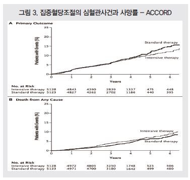 이렇게 노인 당뇨병의 유병특성을 그대로 나타내는 환자들을 A1C 6.4% 대로 집중치료했더니, 표준치료군(7.5%)에 비해 심혈관사건 예방에는 유의한 차이가 없었고 사망은 22% 증가했다<그림 3>.