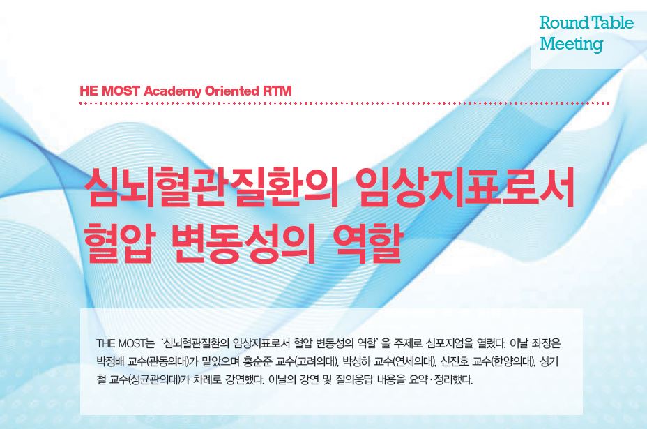 박성하 혈압 변동성을 아직 임상에 적용하기 어려운 이유는 예후에 영향을 미칠 수 있는 혈압 변동성의 기준이나 치료의 기준점이 정립돼 있지 않기 때문입니다. 따라서 실제 임상에서 혈압 변동성의 역치를 고려하기는 어려우며 진료실 혈압과 24시간 ABP 및 가정 혈압을 적절히 활용하고 반감기가 긴 약제를 사용해 혈압 변동성을 감소시키는 것이 적절하다고 판단됩니다. 고령의 고혈압 환자 중에는 혈압 변동성이 심해 갑자기 기립성 저혈압이 나타나는 경우가 있는데 이는 연령이 증가할수록 혈압의 자동 조절능이 감소하기 때문에 발생하는 것입니다. 최근 진행된 연구에 의하면 기립성 저혈압이 있는 고혈압 환자가 혈압 치료를 하지 않을 경우 압력 나트륨뇨배설항진(pressure natriuresis)에 의해 오히려 혈관 내 혈액량이 감소하게 되고, 압수용체에 의한 자동 조절능을 더 감소시켜 기립성 저혈압과 혈압 변동성이 악화될 수 있는 것으로 확인됐습니다. 즉, 기립성 저혈압이 있는 고혈압 환자에서는 저혈압 증상이 악화되지 않는 범위 내에서 항고혈압제를 사용하는 것이 기립성 저혈압에 의한 낙상 빈도를 줄일 수 있습니다.