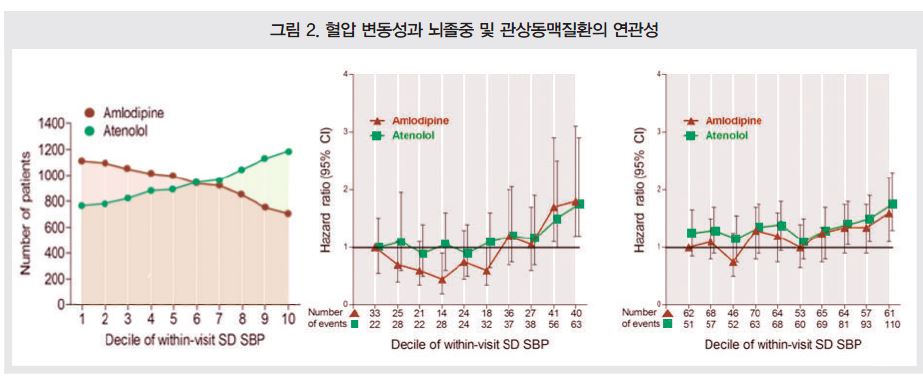 ASCOT 연구에서는 약 1만8000명 환자를 대상으로 visit-to-visit 변동성, within-visit 변동성을 분석했고 이 중 약 1900명의 환자에서는 24시간 ABP를 측정했다. 베타차단제를 사용한 군에 비해 CCB를 사용한 군의 혈압 변동성이 낮았는데, 이런 효과가 약제 계열의 차이에 의한 것인지 작용시간에 따른 약동학적 차이에 의한 것인지에 대해서는 명확하지 않다. 또한 평균혈압에 비해 혈압의 SD나 평균에 독립적인 변동성(variability independent of mean, VIM)이 뇌졸중 예측에 더 효과적인 것으로 확인됐다. 통계적으로 평균혈압을 보정한 경우에는 위험비가 유의한 차이를 보였으나 혈압 변동성을 보정한 경우에는 유의성이 나타나지 않았기 때문에 CCB를 사용한 군과 베타차단제를 사용한 군에서 효과 차이를 결정하는 것은 혈압 변동성인 것으로 추측할 수 있었다. 혈압 변동성이 클수록 뇌졸중 및 관상동맥질환의 위험성이 높으므로 CCB군이 베타차단제 군에 비해 심혈관질환의 위험성이 낮았다<그림 2>.
