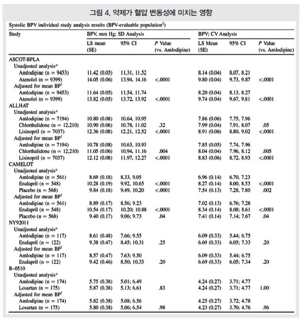 Anglo-Scandinavian Cardiac Outcomes Trial(ASCOT) 연구와 Antihypertensive and Lipid-Lowering Treatment to Prevent Heart Attack Trial(ALLHAT) 연구를 통해 amlodipine은 혈압 변동성을 감소시키고 atenolol은 혈압 변동성을 증가시키는 것으로 확인됐다. 특히 amlodipine은 고령, 혈관 경직 등의 다양한 위험인자를 가진 환자에서 다른 약제에 비해 혈압 변동성을 효과적으로 감소시켰다. 메타분석 결과, amlodipine이 혈압 변동성 감소에 가장 효과적이었으며 SD와 변동계수(coefficient of variation, CV)로 분석했을 때도 동일한 결과를 얻었다(J Am Soc Hypertens 2014;8:340-9)<그림 4>.