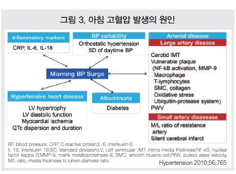 혈압의 SD가 증가할수록 표적장기의 손상이 커지며 아침 고혈압이 있는 경우에는 좌심실비대를 동반하는 등 예후가 더 나빠지게 된다(J Clin Hypertens 2010:12:776-83). 아침혈압에는 약제의 반감기, 환자의 신체 활동 정도나 자세에 따른 교감신경의 작용, 혈액량 등 혈압의 단기간 조절과 관련된 인자가 모두 관련된다. 아침 고혈압이 지속적이지 않은 약제의 혈압조절 효과나 단기간의 혈압조절 기전과 연관된다고 볼 때, 아침 고혈압이 나타나는 환자의 예후가 나쁜 것은 야간에도 혈압이 높기 때문인 것으로 추측할 수 있다. 혈관 경직도가 심하거나 맥압이 높은 경우에는 그 자체만으로도 수축기의 부하가 증가해 좌심실비대가 발생할 수 있고 그 중에서도 동심성 좌심실비대의 발생률이 높은 편이다. 아침 고혈압 발생과 관련된 인자는 매우 다양하므로 여러 관점에서 그 원인을 분석할 수 있을 것이다(Hypertension 2010;56:765-73)<그림 3>.
