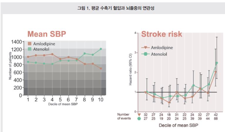 ASCOT-BPLA 연구에서는 뇌졸중의 위험성은 평균 수축기혈압이 높은 군에서 증가했으며 베타차단제를 사용한 군의 뇌졸중 위험성이 가장 높은 것으로 확인됐다<그림 1>.