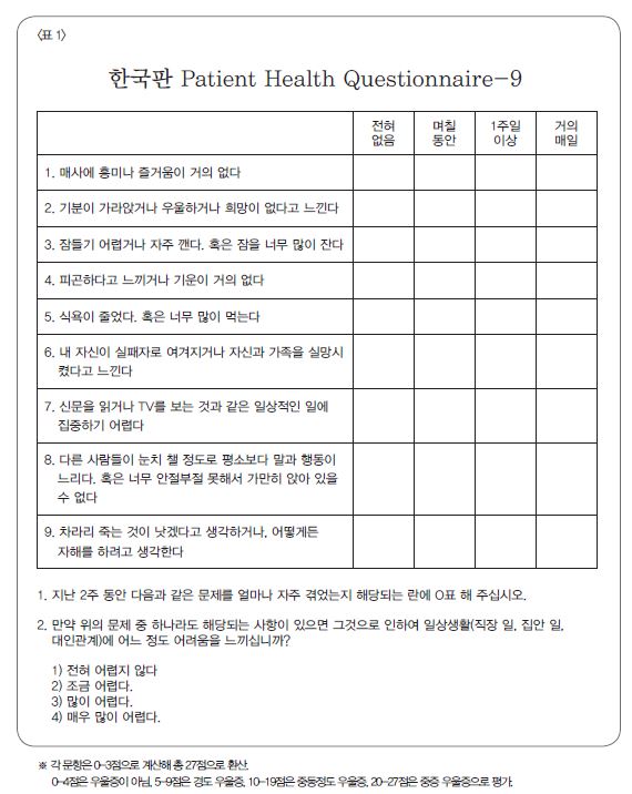 게다가 미국예방서비스태스크포스(USPSTF) 가이드라인에서도 수행시간이 5분 이내이면서 민감도 0.8, 특이도 0.7 이상이면 우울증 진단에 유용한 선별도구로 활용할 수 있다고 밝히고 있다. 여기에 더해 진료지침에서는 PRIME-MD, PDSQ 등 환자가 자가보고를 할 수 있는 도구들도 소개하고 있다.