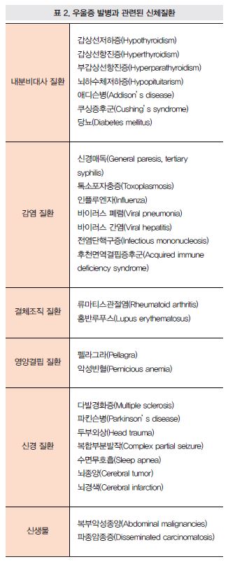 한편 코카인·마약·술 등 물질의 사용, 항암제, 호르몬 제제 등도 우울증을 유발할 수 있기 때문에 이에 대한 평가도 고려해야 한다고 덧붙였다.