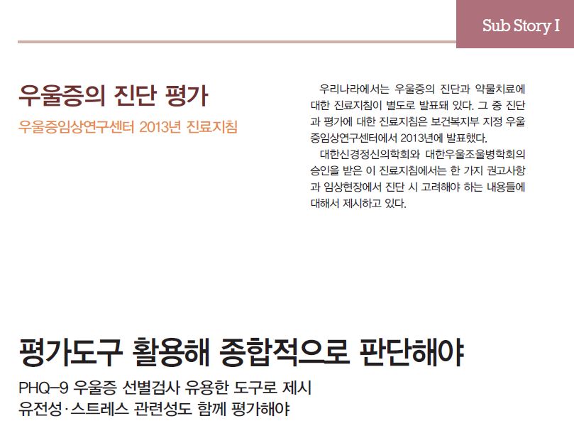 우리나라에서는 우울증의 진단과 약물치료에 대한 진료지침이 별도로 발표돼 있다. 그 중 진단과 평가에 대한 진료지침은 보건복지부 지정 우울증임상연구센터에서 2013년에 발표했다.