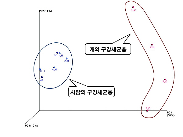 사람의과 개의 구강 세균총 유사도를 거리로 표현한 그림에서 사람 샘플(H로 표시)은 사람끼리, 반려견 샘플(D로 표시)은 반려견끼리 몰려 있어 두 종은 세균총 차이가 크다는 사실을 확인할 수 있다.