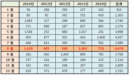 식품의약품안전처가 지난 2010년부터 2014년까지 5년간 월별 식중독 발생추이를 분석한 결과에 따르면, 8월 식중독 환자수가 4676명으로 집계돼 가장 많았고, 6월 4457명, 9월 3706명, 5월 3698명 순이었다.