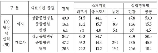 아울러 의료기관의 100병상당 인력 현황을 살펴보면, 의사는 상급종합병원이 49명, 종합병원 16명, 병원 6명이었고, 간호사는 상급종합병원 84명, 종합병원 47명, 병원 20명으로 산출됐다.