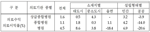 통계집에 따르면 의료기관의 의료수익의료이익률은 상급종합병원이 1.6%, 종합병원이 1.1%, 병원이 4.5%로 모두 흑자를 보였다.