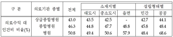 의료수익 대비 인건비 비율은 상급종합병원이 43.0%, 종합병원이 46.3%, 병원이 50.8%로 산출, 상급종합병원에서 병원으로 갈수록 인건비 비중이 높게 나타났다.