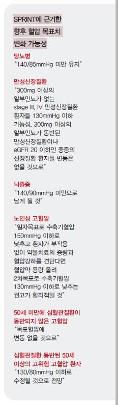 SPRINT 연구에서는 단백뇨가 심한 만성신장질환과 중증의 신장질환(eGFR 20ml/min/1.72㎡ 이하) 환자들은 배제가 되었고 2차종말점인 신장질환의 진행은 통계적인 차이가 없었으며 오히려 기저에 만성신장질환이 없던 환자들에서는 신장질환의 진행이 통계적으로 유의하게 높았으며[HR 3.49(2.44-5.10), P<0.001] 전체적으로 급성신부전증의 발생빈도가 적극적 치료군에서 유의하게 높았다[HR 1.66, P<0.001]. 종합해보면 300mg 이상의 알부민뇨가 없는 stage III, IV 만성신장질환 환자들에서는 목표혈압이 130mmHg이하로 하향조절이 될 가능성은 있지만 300mg 이상의 알부민뇨가 동반된 만성신장질환이나 eGFR 20 이하인 중증의 신장질환 환자들에서는 목표혈압기준에 변동은 없을 것으로 생각된다.