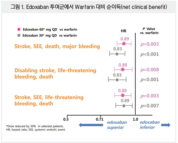 출혈성 뇌졸중, 심혈관 사망, 모든 원인의 사망, 심근경색 등의 이차 평가변수도 대부분 edoxaban군에서 개선된 결과를 보였으나 허혈성 뇌졸중에 대한 고용량 edoxaban의 위험비는 1.00으로 warfarin과 같았고 저용량 edoxaban의 경우 위험비가 1.41로 warfarin보다 열등한 결과를 나타냈다. 순이득(net clinical outcome)을 분석한 결과에서는 대부분 edoxaban 투여군에서 개선된 위험비를 나타냈다<그림 1>.