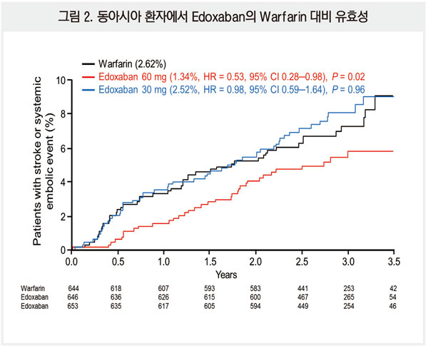 ENGAGE AF-TIMI 48 연구에는 한국인 환자 240명을 포함한 1,943명의 동아시아 환자가 포함됐다. 동아시아 환자의 경우 서양 환자와는 다른 기저 특성(baseline characteristics)을 나타냈는데, 여성 환자의 비율이 서양 환자에 비해 적었고 평균 체중이 19 kg 적었으며 CrCl 수치가 50 mL/min 이하이거나 체중이 60 kg 이하인 환자의 비율이 높아 무작위 배정 시 edoxaban 용량을 감소한 환자의 비율이 서양 환자에 비해 높았다. 하위군 분석 결과, 고용량 edoxaban은 동아시아 환자에서 warfarin 대비 뇌졸중 및 SEE 발생률을 감소시켰으며 저용량 edoxaban은 warfarin과 유사한 효과를 나타냈다<그림 2>.