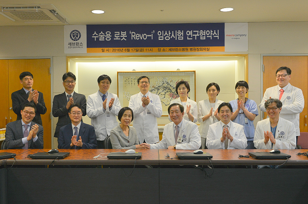 세브란스병원과 미래컴퍼니는 17일 세브란스병원 병원장실에서 '복강경 수술로봇 레보아이(Revo-i) 임상시험 연구협약식'을 갖고 본격적인 임상시험에 들어갔다.