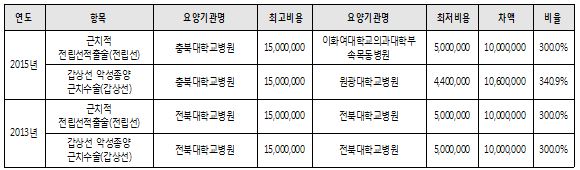 상급병실료와 다빈치로봇수술비 모두 2013년과 비교해 최고비용와 최저비용의 차이는 크지 않았다.
