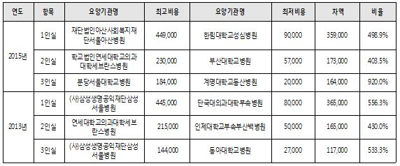 2015년 기준 항목별 비급여 현황을 살펴보면, 상급병실료의 경우 서울아산병원이 가장 비싸고 한림대성심병원이 가장 저렴했다. 서울아산병원의 1인실 상급병실료는 44만 9000원, 한림대성심병원은 9만원이다.