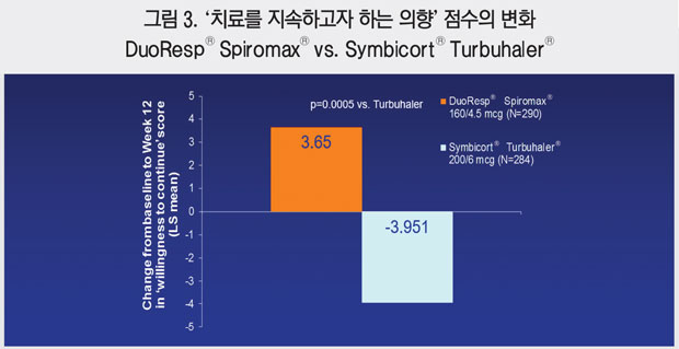 ASSET 연구는 DuoResp® Spiromax®와 Symbicort® Turbuhaler®의 유효성과 안전성을 비교한 비열등성 디자인의 임상연구이다. 지속성 천식(persistent asthma)이 있는 성인 및 청소년 환자들을 대상으로 진행했다. 피험자들은 선별검사 후 14±2일 동안 기존의 안정적인 천식 치료를 유지하다가 두 군으로 무작위 배정되어 이중맹검 형태로 12주 동안 DuoResp® Spiromax® 또는 Symbicort® Turbuhaler®로 치료받았다. 연구 결과 12주 동안 아침 최대 호기량(morning peak flow)의 변화치는 두 군간 유의한 차이가 없었다. 두 치료제가 동일한 약제로 구성되어 있고, 피험자들이 모두 흡입기를 문제 없이 사용할 수 있는 정도로 숨을 들이마실 수 있는 상황에서 어떤 기기가 더 우수한지 조사하는 것은 쉽지 않기에 이 결과는 놀랍지 않았다. 그런데 이 연구에서 실시한 환자 만족도 및 선호도 설문조사에서 '치료를 지속하고자 하는 의향'에 대한 점수가 DuoResp® Spiromax®는 기준치에 비해 유의하게 증가한 반면, Symbicort® Turbuhaler®는 기준치에 비해 유의하게 감소됐다<그림 3>.