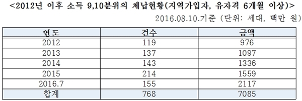 김 의원에 따르면 소득 9, 10분위 고소득자들의 건보료 체납 건수는 2012년 119건에서 2015년 214건으로 79%p 증가했고, 올해 7월을 기준으로 155건이 체납됐다.