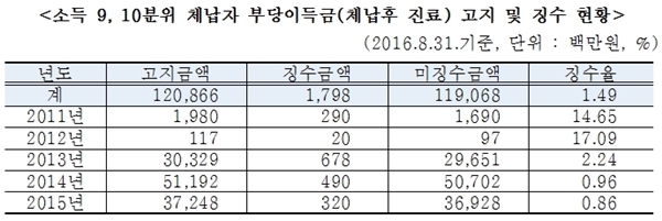 하지만 이에 대한 징수액은 17억 9800만원에 그쳐, 징수율은 1.49%에 불과했다.